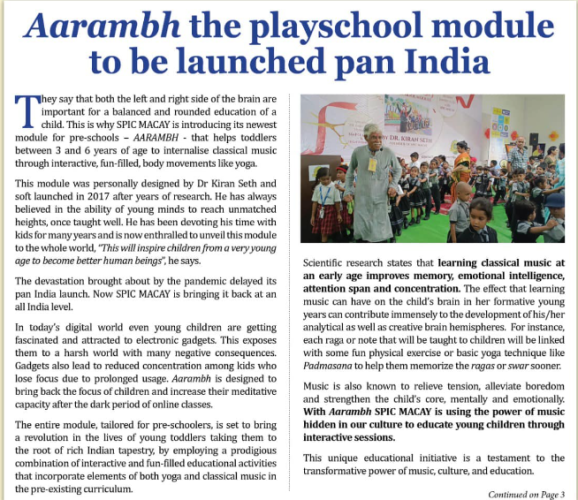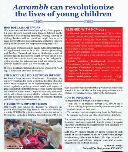 Research has suggested that learning classical music at an early age improves memory, emotional intelligence and concentration. The effect that learning music can have on the child’s brain in her formative young years can contribute immensely to the development of her brain. This is proven to relieve tension, alleviate boredom and strengthen the child’s core, mentally and emotionally. SPIC MACAY is using this power of music to educate young children through interactive sessions in their new module.