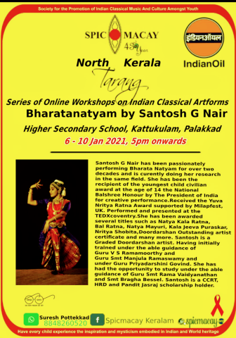 Image Ms Santosh Nair will conduct on line Bharatanatyam Work Shop for Higher Secondary school as per the above details Chapter Kerala