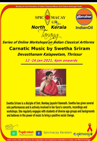 Image Swetha Sriram who is disciple of Vidushi Bombay Jayashri will conduct on line workshop as per details for Devasthanam Kalapeedam Chapter Kerala