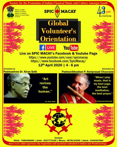 SPIC MACAY invites you to attend first ever Global Volunteer's Orientation on 12th April 2020 from 4-6pm. We had wonderful orientation sessions by Padma Vibhushan Pandit Hariprasad Chaurasia, Padmashree Dr. Kiran Seth with volunteers followed by interactive Q&A session. To view the complete session, kindly link the following: