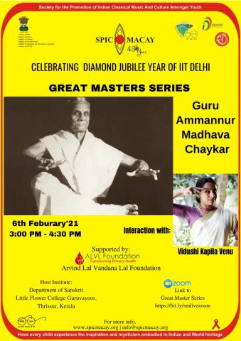 SPICMACAY Great Master Series presents legendary Kudiyattam artist Padma Bhushan Guru Ammannur Madhava Chakyar. Live interaction with his disciple Vidushi Kapila Venu.