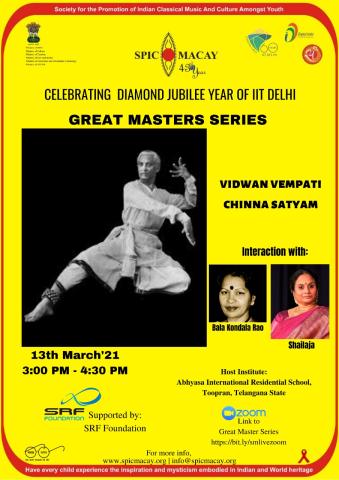 Image SPIC MACAY Presents Great Master Series : Vidwan Vempati Chinna Satyam Date : 13th March, 2021 Timing : 3:00 pm to 4:30 pm. Zoom Link : bit.ly/smlivezoom Chapter Telangana