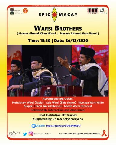 Image Qawwali Recital by Warsi brother (Nazeer Ahmed Khan Warsi and Naseer Ahmed Khan Warsi) Date: 26th December 2020 Time: 6:30pm Day: Saturday Chapter Andhra Pradesh