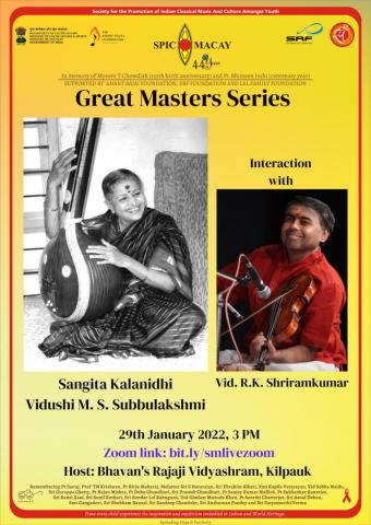 SPIC MACAY Great Master Series : Featuring the legendary Sangeet Kalanidhi Late Vidushi M. S. Subbulakshmi, a Carnatic singer and the first musician to receive the Bharat Ratna through an interaction with Vidwan R. K. Shriramkumar, a prominent violin