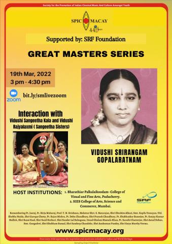 Featuring Vidushi Srirangam Gopalratnam, in an interaction with Vidushi Sangeethakala and Vidushi Rajyalaxmi (Sangeetha sisters) (followed by screening of an old video clip)