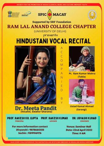 SPIC MACAY Ram Lal Anand College Chapter Presents : HINDUSTANI VOCAL RECITAL by Dr. Meeta Pandit