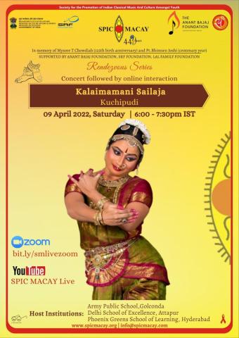 Image SPIC MACAY Rendezvous Series : BHARATANATYAM KUCHIPUDI Featuring Kalaimani SailajaTime : 1800 to 1930 hrs ISTDate : 9th April, 2022 Chapter Delhi (NCR)