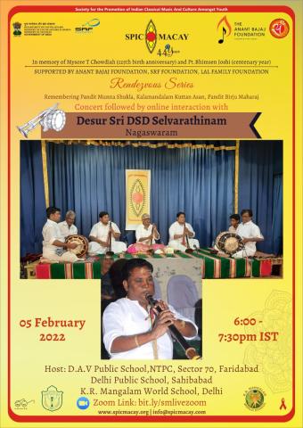 Image SPIC MACAY Rendezvous Series : NÃGASWARAM/NADASWARAM Featuring Desur Sri DSD Selvarathinam Time : 1800 to 1930 hrs ISTDate : 5th February, 2022 Chapter Delhi (NCR)