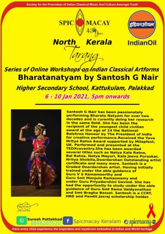 Image Series of Online Workshops on Indian Classical Artforms Bharatanatyam by Santosh G Nair Higher Secondary School, Kattukulam, Palakkad 6-10 Jan 2021, 5pm onwards Chapter Kerala