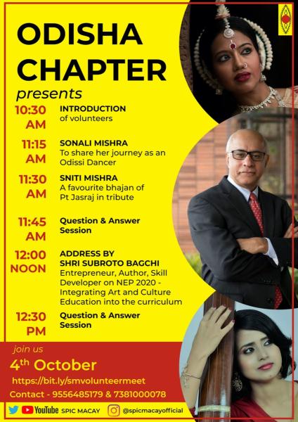 Please join for a session with SPIC MACAY Odisha chapter this Sunday (4th Oct 2020). The session will witness an interaction with Odissi dancer Sonali Mishra followed up by a bhajan by Sniti Mishra and a talk by Mr. Subroto Bagchi.